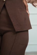 The NIA waist coat is tailored to perfection , fully lined is a refined autumn essential crafted in a rich earthy brown cotton suiting fabric . Featuring a structured waistcoat, tailored trousers, and a beautifully pleated skirt option, this coat offers versatility for the modern professional.
