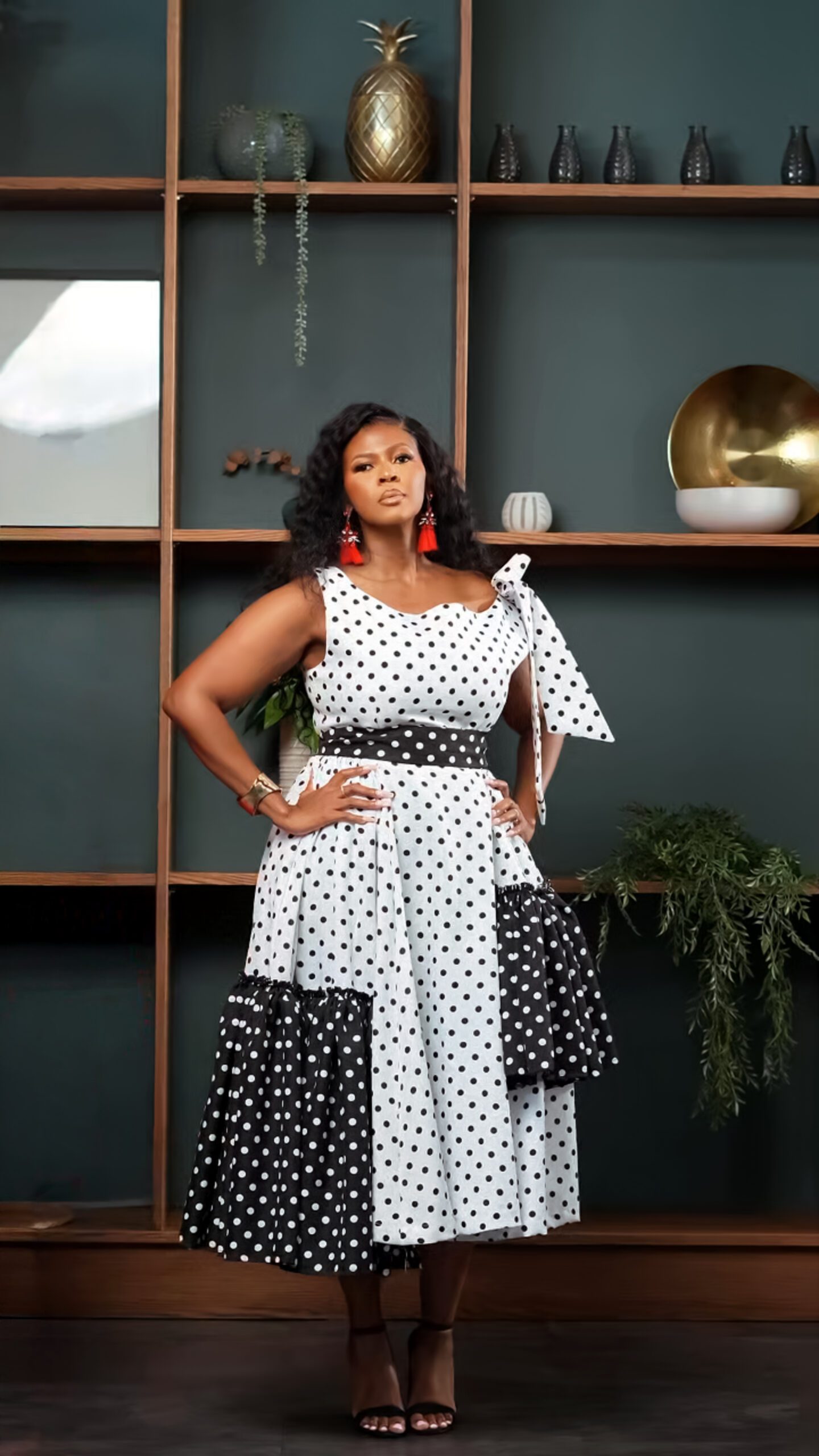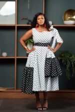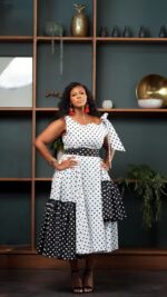 Introducing our iconic Tshidi DRESS, now reimagined in a bold polka-dot contrast that blends timeless charm with modern sophistication. Designed for the woman who loves effortless luxury, this set offers a beautifully tailored fit that flatters every shape.