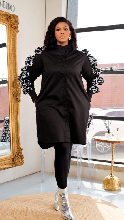 The Zola Shirt dress redefines statement dressing with a structured shirt dress featuring striking printed tassel detailing at the back. The interplay of texture, print, and movement creates a powerful silhouette designed to turn heads.